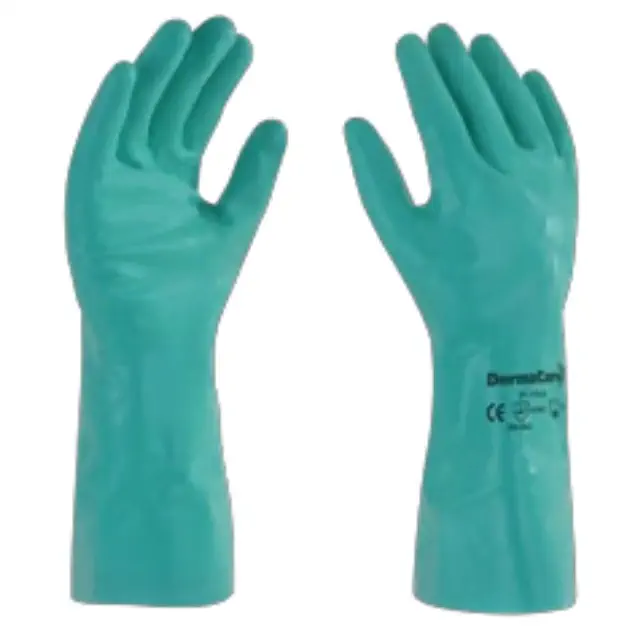 Guante de nitrilo verde de 13″ de largo y 13 milésimas de espesor, con puño recto. El nitrilo en una de sus presentaciones más usadas, ya que por las características de este modelo, con su grosor y diseño, cuenta con alto rango de protección procesos mecánicos e industrias químicas, se recomienda para el manejo de solventes, aceites, pinturas y barnices, el relieve de la palma ofrece mayor adherencia en procesos resbaladizos o con presencia de líquidos. Aceptado por FDA para la manipulación de alimentos.