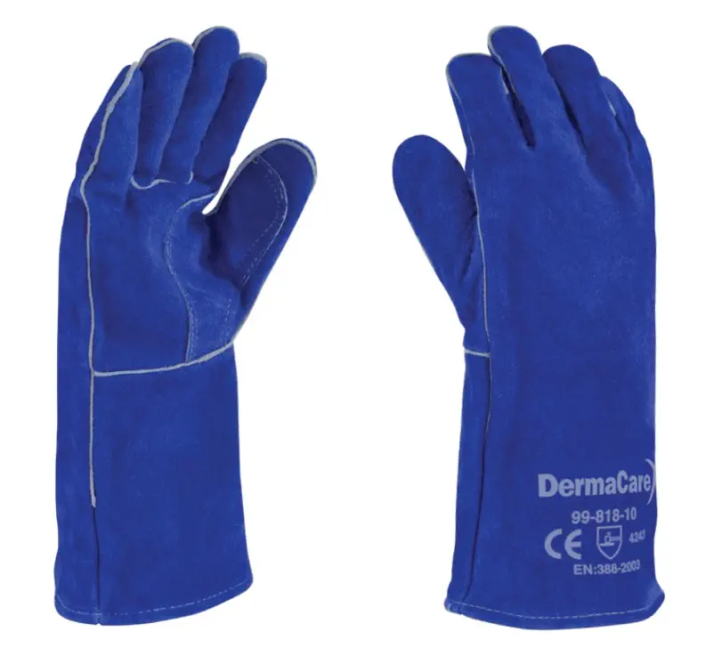 Guante de carnaza de res azul, hilo Kevlar®, forro de hule espuma y algodón, puño recto 14” pulgadas. Guante para soldador en carnaza de res curtida al cromo, con doble engrase con tratamiento a base de aceites, 35.5 cm de largo. Diseño tipo americano, con forro de hule espuma y algodón en todo el guante para alargar su periodo de vida. Cosido con hilo Kevlar®, lo que permite que no se quemen las costuras al manejar altas temperaturas, refuerzo del mismo color del guante en palma y dedo pulgar.